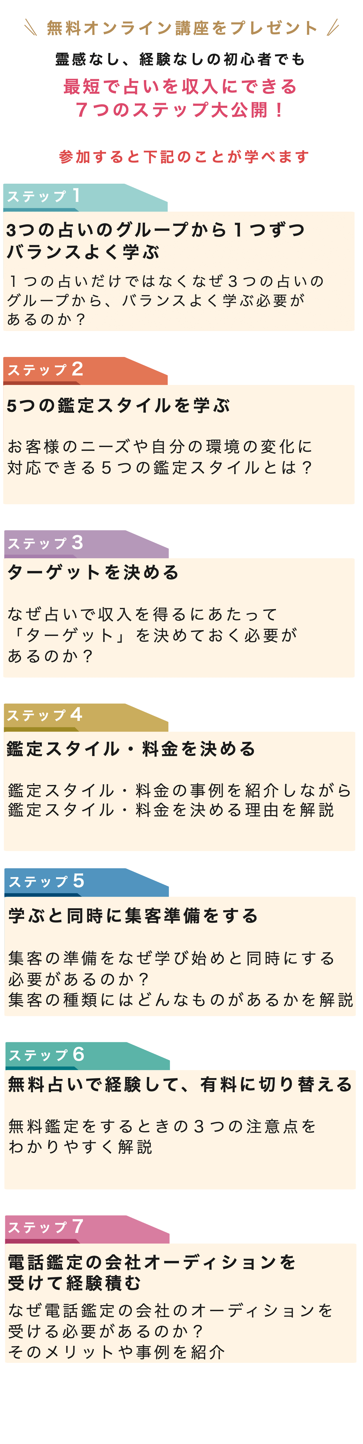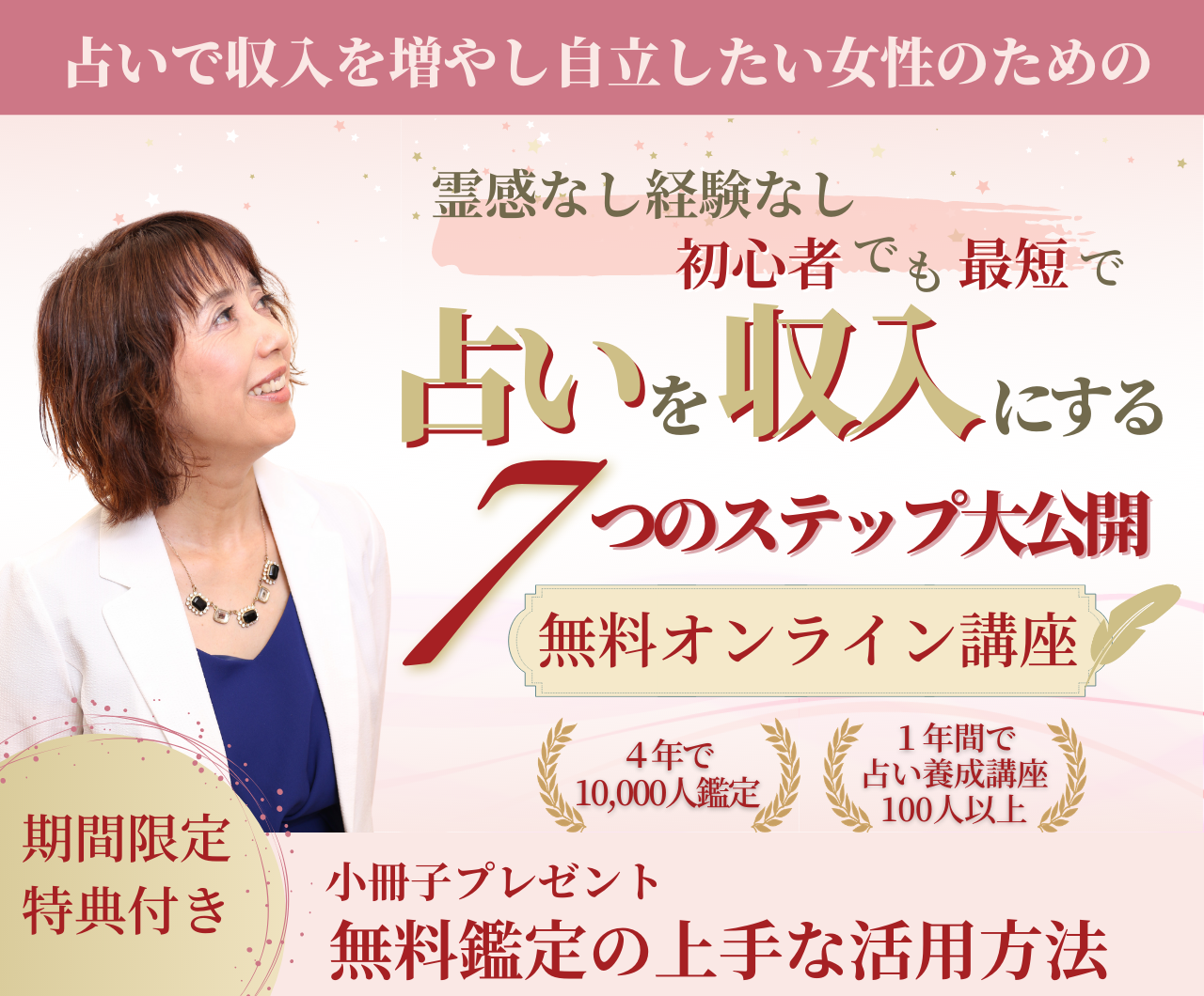 これから占いを収入にしたいと思っている方には、私のように遠回りせず、数百万円など高額な投資もせずに占いを収入にしてもらいたいという思いで、この無料オンライン講座を作成しました。